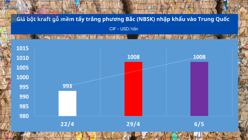 Giá bột kraft gỗ mềm tẩy trắng phương Bắc ngày 6/5 giữ nguyên mức 1008 USD/tấn giống 7 ngày trước.