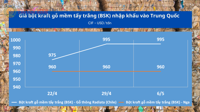 Giá bột kraft gỗ mềm tẩy trắng – Gỗ thông Radiata ngày 6/5 không thay đổi so với 7 ngày trước, đạt mức 995 USD/tấn.