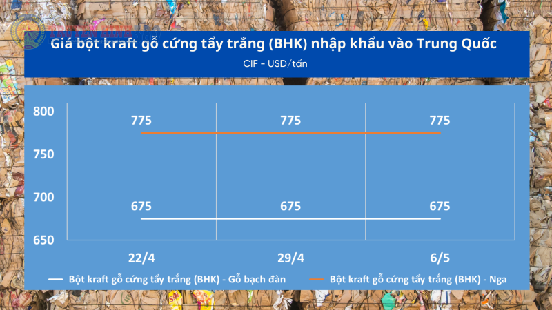 Trong đó, giá bột kraft gỗ cứng tẩy trắng – gỗ bạch đàn là 675 USD/tấn. Giá bột kraft gỗ cứng tẩy trắng của Nga là 775 USD/tấn.